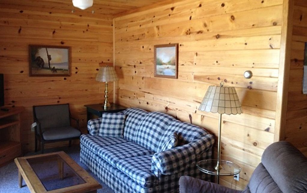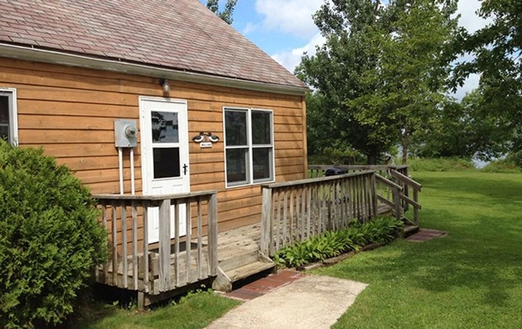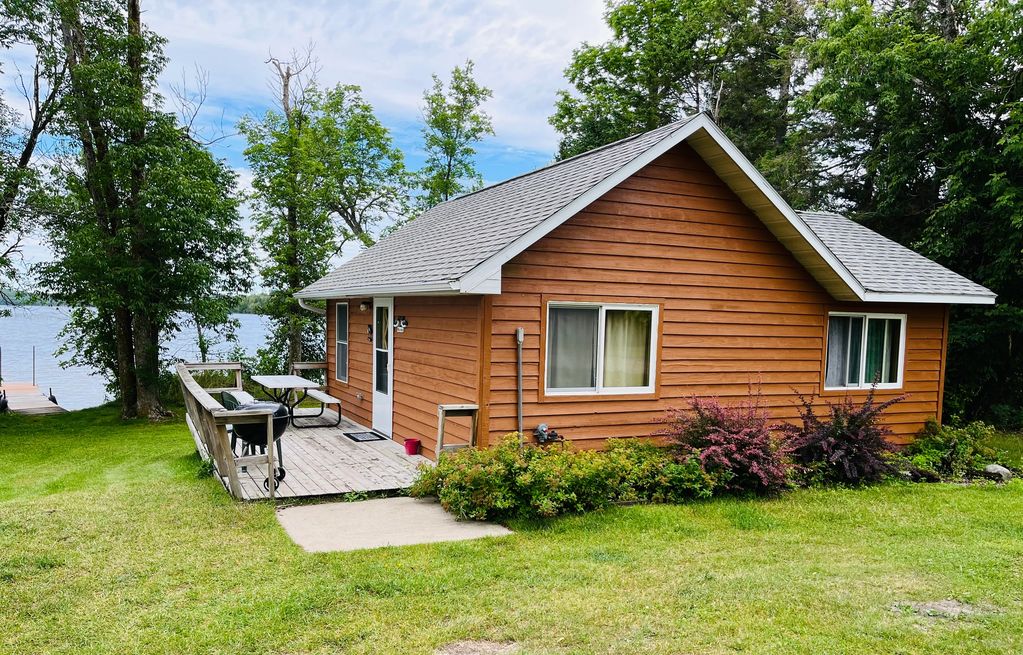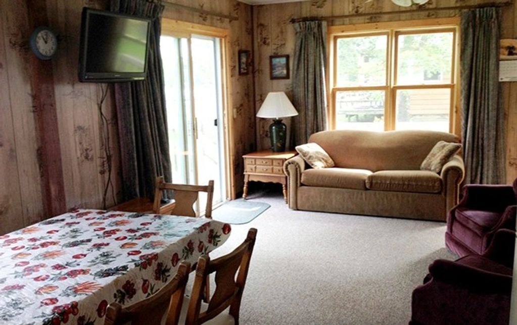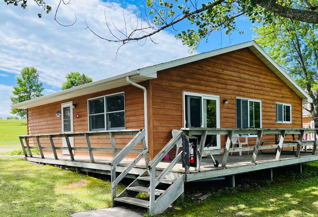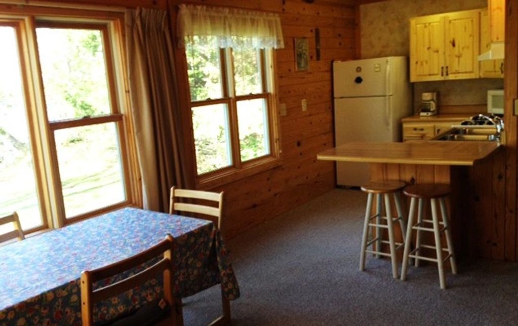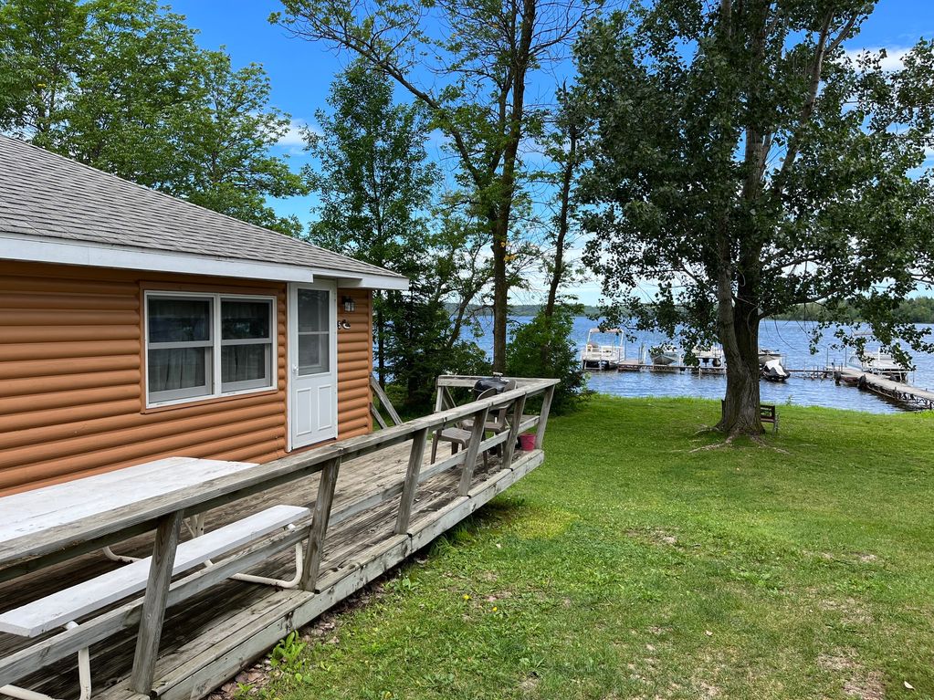 Cabin #7 is a lakefront 2 bedroom cabin. One room has a queen bed and the other bedroom has 1 full-size bed and 1 twin.