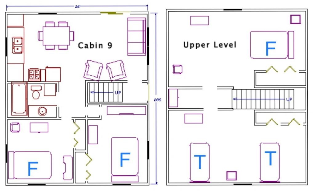 Cabin #9 is a 4 bedroom cabin. There are 2 bedrooms upstairs and 2 bedrooms down stairs.