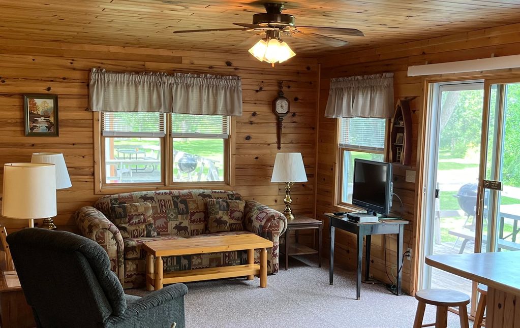 Cabin #4 has a nice open floor plan with glass doors that go out to the lake facing deck.