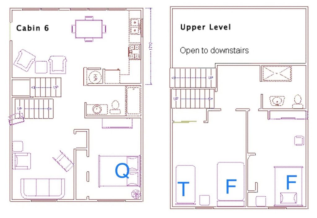Cabin #6 is a lakefront 2 story cabin. There is one bedroom downstairs and 2 bedrooms upstairs. This cabin has 2 bathrooms.