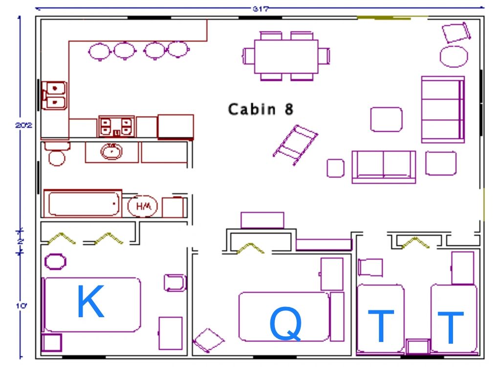 Cabin #8 is a 3 bedroom cabin. There is a king size bed, a queen bed, and 2 twin beds.